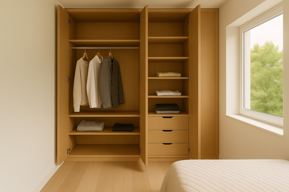 Roupeiros projetados à medida da sua rotina, com organização inteligente e um design discreto que valoriza a luz natural e o equilíbrio do espaço.